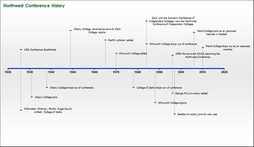 The NWC was formed in 1926, making it one of the oldest athletics conferences in the western United States.  For 60 years, the Northwest Conference sponsored sports exclusively for men. In 1984, the Northwest Conference joined with the Women's Conference of Independent Colleges to become the Northwest Conference of Independent Colleges. The name was shortened to its current moniker in 1996 when it joined the NCAA.